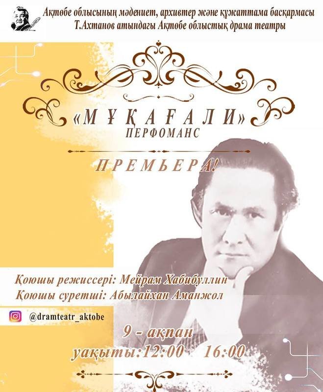 Т.Ахтанов атындағы облыстық драма театрының қазақ труппасы режиссер Мейрам Хабибуллиннің қоюымен жыр жауһары Мұқағали Мақатаевтың туған күніне орай «Мұқағали» атты перфомансты сахналайды.