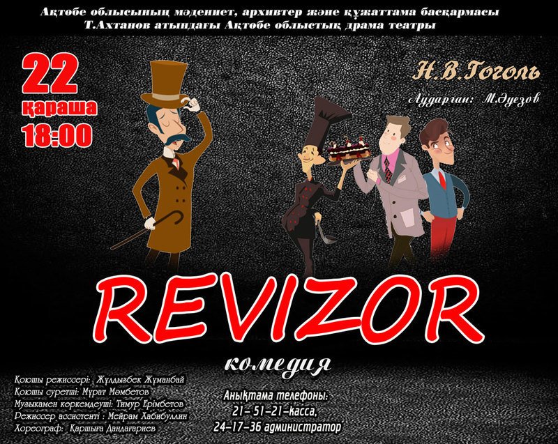 Пьеса: шағын қалада ревизордың келуін күтіп жүрген шенеуніктер басқа адамды ревизор деп асығыс қабылдағанын, ал, нағыз ревизор келген сәттегі мемлекет қызметіндегі шенеуініктердің іс-әрекеттері жайында баяндайды.Бұл қойылымда күйініш басым ба, сүйініш басым ба? Оны театрға «Ревизордан» бұрын келіп отырсаңыз байқайсыз. Иә, театрға асығыңыздар, «Ревизор келе жатыр!..»