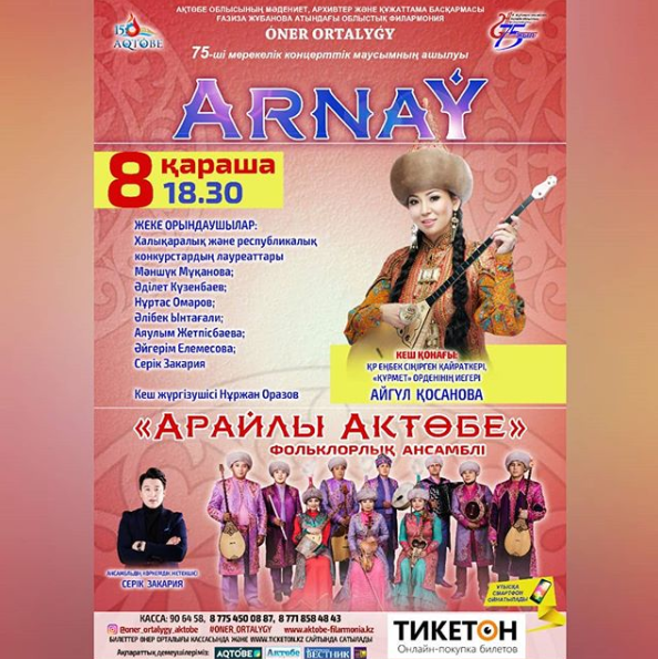 Сіздерді 8 қараша күні, сағат 18.30 да Ғ.Жұбанова атындағы облыстық филармонияның 75-ші концерттік маусымының ашылуына орай өтетін халықаралық конкурстардың лауреаты "Арайлы Ақтөбе" фольклорлық ансамблінің "АРНАУ" атты МАУСЫМАШАР концертіне шақырамыз!
