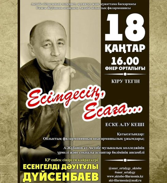 Видный деятель культуры, благодаря которому было сделано много в сфере искусства и культуры в Актюбинской области Заслуженный деятель РК - Есенгелдi Даутович Дуйсенбаев. Открытие многих творческих коллективов, проведение важных творческих фестивалей и конкурсов, организация работы областной филармонии им.Г.Жубановой, приезд именитых звезд классической сцены, обширные развлекательные программы для любителей эстрадной музыки, развитие джазового искусства, детского исполнительского мастерства все это связано с его именем. Именем творца, музыканта и большого профессионала своего дела. Всех, кто знал Есена Дуйсенбаева мы ждем на памятном концерте, организованном областной филармонией им.Г.Жубановой в зале Центра искусств
