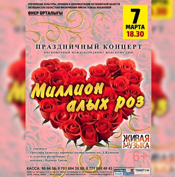Областная филармония им. Г. Жубановой в преддверии Международного женского дня приглашает милых дам на концерт «Миллион аллых роз» посвященный всем нашим дорогим женщинам. В концертной программе прозвучат песни из репертуара Муслима Магомаева, Анны Герман, Александра Серова, Яна Райбурга, Аллы Пугачевой, Ескендира Хасангалиева, Шамши Калдаякова и Марата Омарова. Лучшие песни о прекрасной половине человечества! ⠀