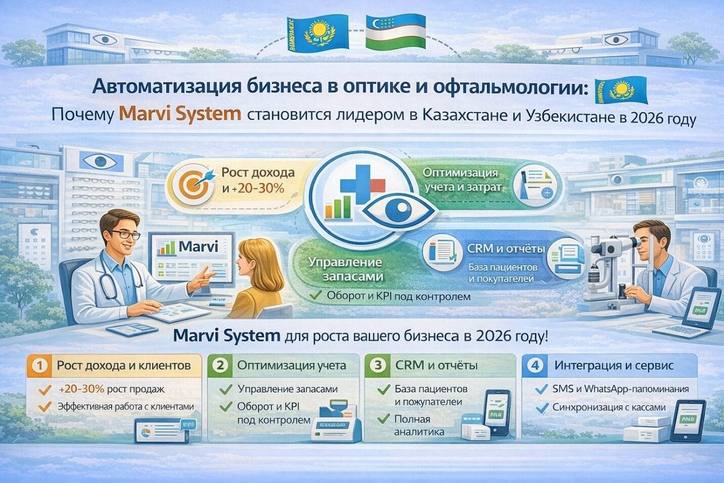 Marvi System – это инвестиция в будущее вашего бизнеса в оптике и офтальмологии. С ростом рынка в Казахстане и Узбекистане, такая автоматизация обеспечит конкурентное преимущество. Для старта посетите Marvi System или InAtyrau.
